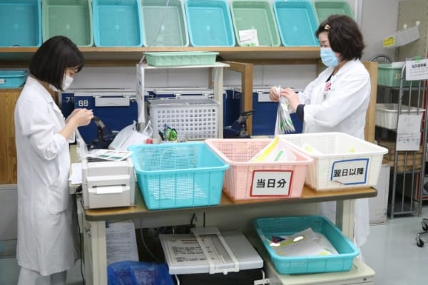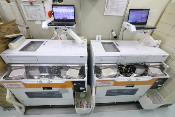 注射薬の医師の指示入力は、すべてオ-ダリングシステムによるコンピュ-タ-によって行われ、医師の入力時に相互作用・処方量・手技などのチェックを自動で行っています。調剤業務と同様の疑義照会を行い、配合変化等のチェックをしています。注射薬は、患者さんごと、1回使用ごとに袋に入れられ、さらに薬剤によっては病棟看護師向けの注意事項が記載された用紙も添付し、病棟に送られます。1回使用ごとに注射薬を袋に入れる注射薬自動分包機を可動させて、よりスピ-ディに、より間違いのない調剤を行っています。