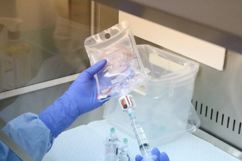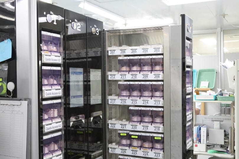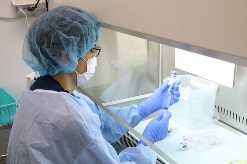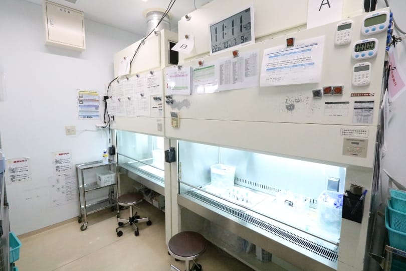 注射薬の抗がん剤は、入院、外来問わず、薬剤部内および化学療法センターに併設された2ヶ所で、安全キャビネットを用いて無菌的に調製(ミキシング)しています。抗がん剤は、静脈炎など一般的な注射薬と比べて血管のトラブルが多い薬です。また、病棟で抗がん剤をミキシングすると、病棟スタッフだけでなく、患者さんにも抗がん剤が空気中に飛散して吸引してしまうリスク(抗がん剤の曝露)はゼロではございません。薬剤部で調製すること、および揮発性の高い薬剤だけでなく、全薬剤に対して曝露防止器具である閉鎖式薬物移送システムを使用することで、調製する薬剤師だけでなく、病棟や化学療法センターにいる医師、看護師、そして同室におられる他の患者さんにおける曝露をなくすとともに、無菌的に行うことで(静脈炎などに伴う)感染症のリスクも軽減させ、患者さんの合併症を未然に防ぐようにしています。また、高カロリー輸液(TPN)や一部のホルモン製剤についても、クリーンベンチにより無菌的に調製しています。