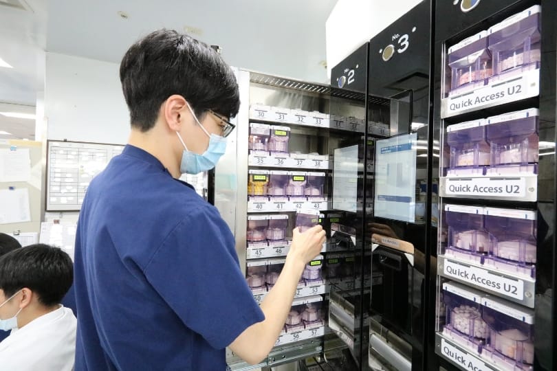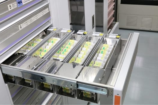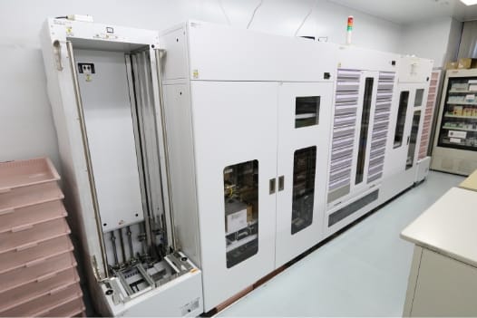 当院では予定入院患者さんについて、原則、入院時に直接薬局窓口に来ていただいて面談し、入院時に家から持ってこられるお薬(当院の外来や、他の病院・医院からの処方薬、薬局や薬店で買われたお薬、健康食品など)の確認を行っています。入院中に行われる治療や検査への影響を考慮し、医師や看護師に注意を促すとともに、中止・減量の検討が必要な場合は、医師に意見を提案しています。ご入院の度に同様の聞き取りを実施して患者さんの時々の状況を常に把握し、入院中に安全な薬物治療を行ううえで必要な情報を得ています。この鑑別業務を効率よく迅速に行い速やかに検査や治療を開始できるよう、持参薬鑑別支援装置を導入し、鑑別の自動化を促進しています。