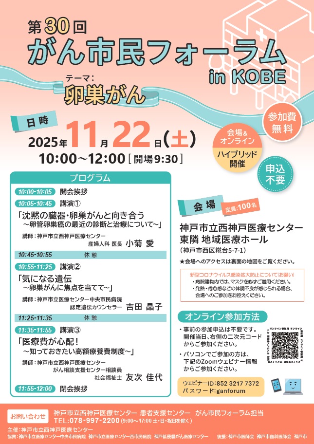 神戸市立西神戸医療センター 患者支援センター がん市民フォーラム担当 (TEL 078-997-2200,9:00~17:00,土日祝を除く) |