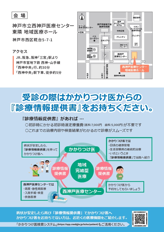 神戸市立西神戸医療センター東隣 地域医療ホール (神戸市西区糀台5-7-1) 申込不要 開催当日 直接お越しください 定員は100名です 参加費無料です |